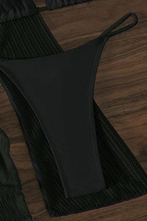 A micro bikini with an O-ring crochet dress pairs minimal coverage swimwear with a stylish, open-weave cover-up. The micro bikini features tiny, sleek pieces for a daring look, while the crochet dress, adorned with metal or plastic O-rings, adds a textured, bohemian touch. This combination offers both boldness and elegance, perfect for making a statement at the beach or pool.